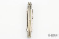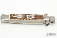 This 9" Picklock by Frank Beltrame features a polished bayonet ground blade with false top edge. The handle has stainless steel bolsters, front and rear, stag scales, brass liners, stainless spring. Excellent condition.