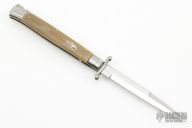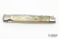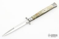 This 11" Swing Guard Auto by Frank Beltrame features a dagger ground blade with false top edge. The handle has stainless steel bolsters, front and rear, honey horn scales, brass liners, stainless spring. Excellent condition.