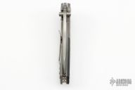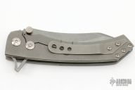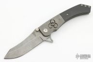 This custom Azrael flipper by Will Zermeno features a stonewashed blade with notched thumbrest and flipper. The handle has a stonewashed titanium dovetailed bolster with radioactive sign, carbon fiber front scale with tumbled titanium lockside, titanium pocket clip for tip up carry, lockbar stabilizer. Nice lock up and blade seating. Excellent condition. Comes with a zippered case.