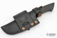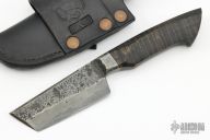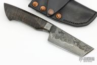 This Everyday Nakiri by Jared Lee features a hand forged 80CRV2 core San Mai Damascus blade with integral bolster, .210" blade stock and 1.390" blade depth, hidden tang construction. The handle is curly ash, black G-10 spacer. Comes with a black leather sheath with copper rivets and a COA. Excellent condition.