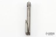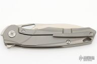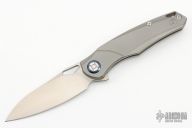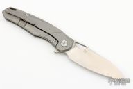 This knife by Kunwu Knives features a satin finished sheepfoot blade with a notched thumbrest and flipper tab.  The handle features a titanium frame with a matching tip up and pocket clip and backspacer.  Mokuti pivot collars.  Excellent Condition.