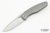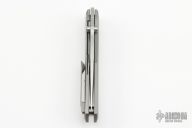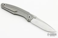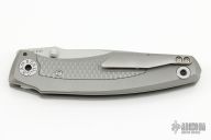 This Knife features a stonewashed blade with dual thumbstuds and a notched thumbrest. The handle features a tumbled titanium frame with a matching tip up pocket clip. Includes a padded zippered case. S/N 134. Excellent Condition.