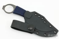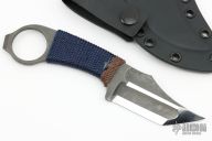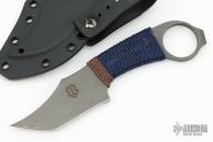 This LOBO Tanto by John Gray Knives features a satin polished and acid tumble finished clip point bowie blade with fullers and a chisel grind, .183" blade stock and 1.320" blade depth, full tang construction with blue/brown cord wrap and a ring at the butt. Comes with a kydex sheath. Excellent condition.