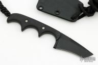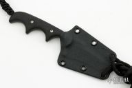 This Minimalist by Alan Folts features a black tanto recurve blade with notched thumbrest, .113" blade stock and .964" blade depth, full tang construction. The handle has black G-10 scales, lanyard hole at the butt. Comes with a kydex sheath. Excellent condition.