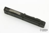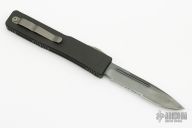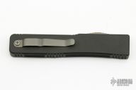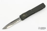 This Early Ultratech by Microtech Knives features a black tumbled drop point partially serrated blade with swedge and fullers. The handle has a black anodized aluminum with ramped steel thumb slide and tip down clip. Has some wear on the blade finish, otherwise good condition. Includes the original sheath.  S/N of 0656 dated 09/2001.