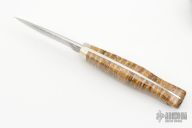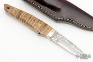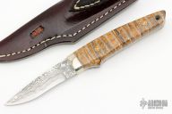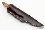 This Hunter by Mr. Itou features a San-Mai Damascus finished drop point blade, .127" blade stock and .744" blade depth, full tapered tang construction. The handle has polished nickel silver bolsters, mammoth tooth scales. Comes with a brown leather sheath. Excellent condition.