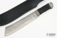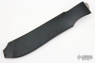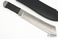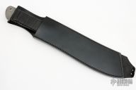 This knife was made as a prototype for a run of licensed replicas made by Hollywood Collectibles. The run was never released, and this is the only Licensed Damascus Rambo 4 knife ever made. The knife features a flat ground Damascus blade with a full tang construction. .334" Blade Stock. 2.587" Blade Depth. The handle has a black wrapped leather grip with a lanyard hole in the butt of the tang. Includes a black leather sheath. Light sheathing marks are visible on the blade otherwise the knife is in excellent condition.