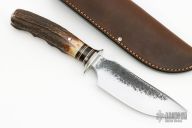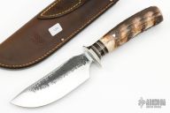 This Semi-Skinner by Jim Behring features a satin finished and hammer marked hollow ground blade with a false top edge, .25" blade thickness and 1.624" blade depth, hidden tang construction. The handle has a nickel silver guard and cap, pinned finger groove sambar stag grip, black/red/yellow spacer pattern. Great look and feel. Comes with brown leather sheath. New from maker!