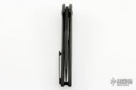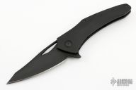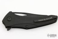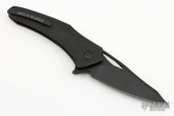 This Virtue from Brous Blades features a black coated drop point blade with swedge and notched thumb rust. The handle has a black coated titanium scales over steel liners. Black coated stainless steel tip up pocket clip. Numbered #194/500. Includes the original box and papers.  Light scuffs are visible otherwise the knife is in Excellent condition.
