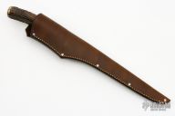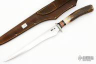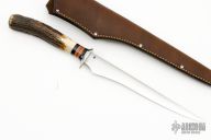 This XL Fillet by Jim Behring features a satin finished convex ground blade with .084" blade thickness and 1.21" blade depth. Hidden tang construction. The handle has a nickel silver guard and butt cap, premium sambar stag grip with a single stainless pin, black, blue, red, and yellow spacers. Great look and feel. Comes with leather sheath. New from maker!
