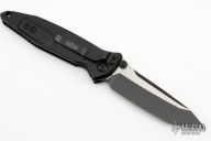 This Socom Elite manual linerlock folder by Microtech Knives has a two-tone black tanto blade with notched thumbrest and dual thumbstuds. Has a black aluminum handle with non-slip inlays, tip down black stainless steel clip and hardware. Serial number 11128 and dated 10/2022. Comes with original box and papers. Excellent condition.