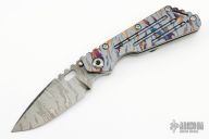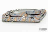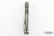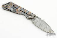 This SMF by Mick Strider features a laser engraved blade with thumbhole and notched thumbrest. The handle has laser engraved titanium frame and tip up titanium clip.  Notches on thumbrest, rear of handle. Nice detent, blade seating and lockup. New condition.