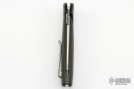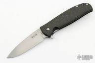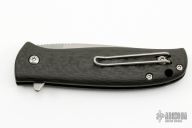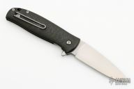 This Skaha By North Arm Knives features a stonewashed drop point blade with a notched thumbrest and flipper.  The handle has marbled carbon fiber scales with an inlaid stainless steel liner and tip up clip. Rides on bearings, nice detent, lockup and blade seating. Excellent condition.