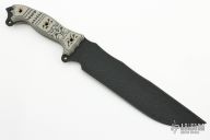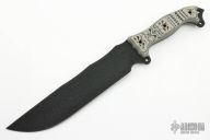 This Anorexic Fusion Battle Mistress by Busse features a black texture finished blade and shaped tan/black G-10 scales. .21" blade thickness and 2.19" blade depth. Full tang construction. New from maker.