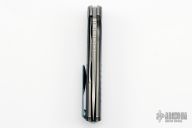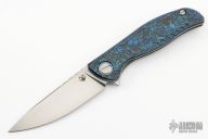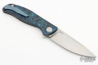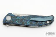 This F3 Flipper from Shirogorov has a tumble finished flat ground spear point Vanax 37 blade with notched flipper. Handle has aquatic blue carbon fiber scales, anodized titanium backspacer, tip up clip and liners. Recessed lanyard bail. Dead center blade seating, excellent detent and lockup. Multi Row Bearing System. Comes with original box.  Excellent condition.