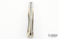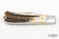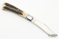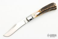 This Trapper by Bill Ruple features a hand rub satin finished blade with a single nail nick.  The handle has stainless steel bolsters, stainless steel liners and spring with stag covers and a stainless steel escutcheon. Has half-stop, flush in all positions. Excellent Condition.
