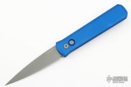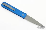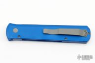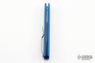 This knife features a bead blasted blade dagger style blade. The handle has a blue aluminum frame with bead blasted hardware and black stainless steel tip up clip. Comes with original box and papers. New from maker.