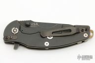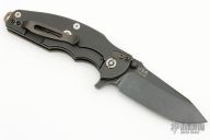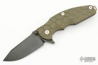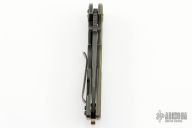 This Jurassic by Hinderer Knives features a black clip point blade with notched thumbrest and flipper. The handle has a black titanium frame with a green G-10 scale, tip up or down reversible clip and a modular backspacer. Nice detent, lockup and blade seating. Teflon washers. Comes with original box. Excellent condition.