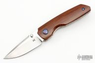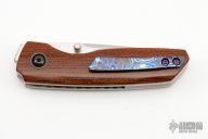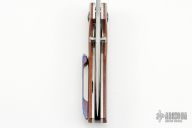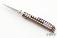 This Nevada Jr. by Chad Nell features a hand rub satin finished blade with false top edge, dual thumbstuds, and notched front flipper. The handle has a satin finish titanium frame [with jeweled interiors] lava lamp black timascus inlay in pivot, zirconium pivot collars, matching timascus tip up clip and backspacer. Rides on bearings, nice detent, lockup and blade seating. Comes with zippered case and COA dated 01/23. New from Maker!