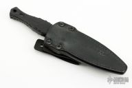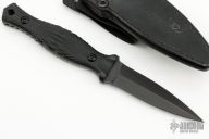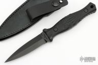 This Galvo Dagger by Les George features a black ceracoated double-edged blade with .170" blade stock and .894" blade depth, full tang construction. The handle has black Tephra G-10 scales and a lanyard hole. Comes with a black leather sheath by Chatanooga Leatherworks. Comes with original box. The tip is missing a little of the finish otherwise the knife is in excellent condition.