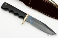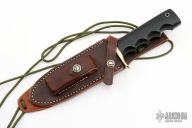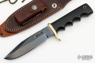 This Model 15 Airman by Randall Made Knives features a clip point gun blued blade with a sharpened top edge, .223" stock. 1.26" blade depth, full tang construction. The handle has black linen micarta handle with finger grips and a brass guard. The Model 15 is designed especially for heavy-duty use and to be as nearly indestructible as possible. Comes with a brown leather sheath. Has a couple light scratches, otherwise excellent condition.