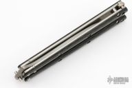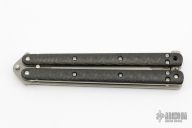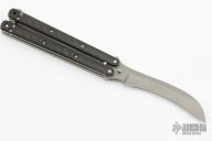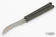 This Balisong by Craig Camerer features a tumble finish hawkbill blade. The handle features satin finish titanium liners, posts and latch. Carbon fiber scales. Excellent condition.