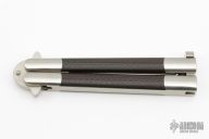This balisong by 29 Knives features a satin finished upswept blade with false top edge. The handle has integral 303 stainless steel handles with dovetailed black/red carbon fiber Inlays, T-latch. Has some light scratches, otherwise excellent condition.