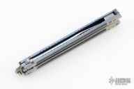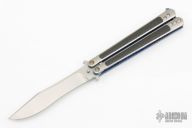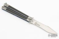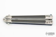 This Balisong from Darrel Ralph features a hand rub satin finished blade. The handle has titanium handles with anodized internals, fileworked stainless steel spacers and fileworked anodize finish latch. Has scuffs and scratches, good condition otherwise.