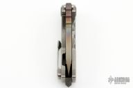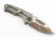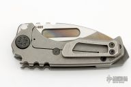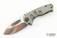 This Micro Praetorian T from Medford Knife and Tool features a Vulcan finished blade with notched thumbrest and fullers. The handle has a tumbled titanium frame with black PVD stainless steel backspacer doubles as a glass breaker, tumbled titanium clip. Comes with a Medford box, hard case and COA dated Nov, 18 2021. Excellent condition.