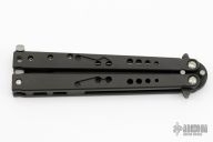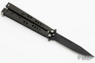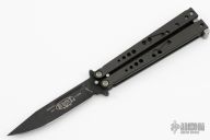 This Dragonfly balisong from Microtech Knives has a black blade and skeletonized black aluminum handles. Dated 12/2002 and #0910. Excellent condition. Hard to find. Comes with the original box and nylon sheath.
