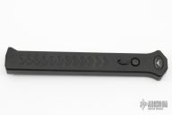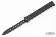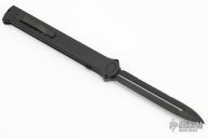 Joining the Estiletto OTF lineup is this fantastic model with a USA cutout on the black anodized aluminum body with black hardware/clip and a black coated dagger blade with partially serrated cutting edge.