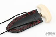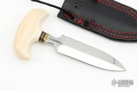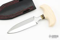 This Push Dagger by Gil Hibben has a double edged and mirror finished blade, .177" blade stock and .998" blade depth, hidden tang construction. The handle has a brass guard and a mammoth ivory grip with black/brass spacers. Comes with a black leather neck sheath. Excellent condition.