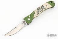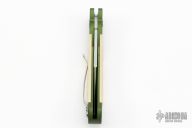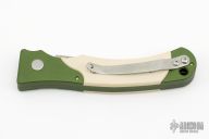 This Small Persian Fighter from Rob Dalton features a satin finish blade and a green aluminum frame with ivory paper micarta inserts on both sides. Satin finished clip. Strong and fast coil spring opening. Excellent condition.