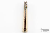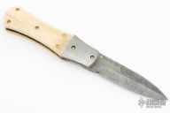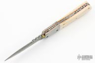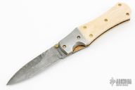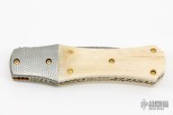 This linerlock, by Lonnie Williams features spear point style blade with a false top edge. There is a single bronze thumbstud. The blade and backspacer are composed of a high contrast rain drop Damascus while the bolsters are made ofbasket weave mosaic Damascus . The liners are composed of anodized and file-worked titanium. The scales are stabilized white bone and all screws are gold. Serial #211 on the inside of the backspacer.  Excellent condition.