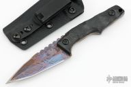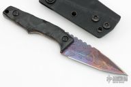 This Muninn Dagger by Bawidamann Blades was named after Odin’s Raven. It features an acid etch with patina finished blade with notched thumbrest and sharpened top edge, .100" blade stock and 1.085" blade depth, full tang construction. The handle has IM Bawidamann Chunked Pattern Carbon Fiber scales (proprietary Carbon fiber composite). Comes ready to carry with the Bawidamann Uberscabbard. New from maker.