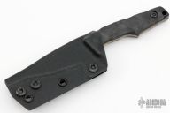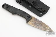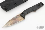 This Muninn Dagger by Bawidamann Blades was named after Odin’s Raven. It features an acid etch with patina finished blade with notched thumbrest, .100" blade stock and 1.085" blade depth, full tang construction. The handle has IM Bawidamann Chunked Pattern Carbon Fiber scales (proprietary Carbon fiber composite). Comes ready to carry with the Bawidamann Uberscabbard. New from maker.