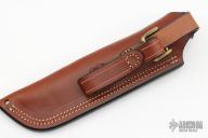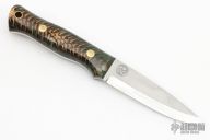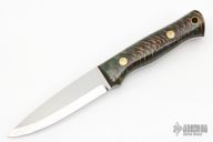 This Mountaineer from Adventure Sworn features a hand rub satin finished scandi ground blade with .154” blade stock and 1.035” blade depth, full tang construction. The handle has green pine cone in epoxy scales with brown linen micarta liners and brass pins and lanyard hole. Comes with a brown leather sheath and zippered case. Comes with original papers. Excellent condition.