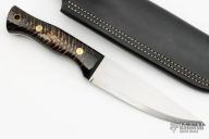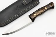 This Tradesman from Adventure Sworn features a hand rub satin finished scandi ground blade with .126” blade stock and 1.329” blade depth, full tang construction. The handle has black pine cone in epoxy scales with black liners and brass pins and lanyard hole. Comes with a black leather sheath and zippered case. Comes with original papers. Excellent condition.