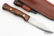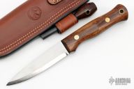 This Mountaineer from Adventure Sworn features a hand rub satin finished scandi ground blade with .120” blade stock and 1.022” blade depth, full tang construction. The handle has desert ironwood burl scales with black canvas micarta liners and brass pins. Comes with a brown leather sheath with matching firesteel and a zippered case. Comes with original papers. Excellent condition.