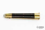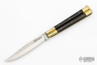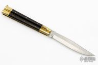 This knife by Gutmann Cutlery is marked "Original Balisong" with brass fittings and round buffalo horn scales. Hand made in Philippines. Part number 11-526 on blade. Comes with original nylon sheath and box. Has some light scratches, otherwise excellent condition.