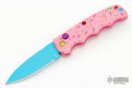Have you ever been unfortunate enough to have to share a donut? Your plight only gets worse when you find you have to cover your high-speed, low-drag, modified, custom, mirror-edged piece of pocket jewelry in sticky sweetness. What you need is a knife designed from the ground up to go to war with a donut. And although its path to existence was unorthodox, the Dessert Warrior is here! This automatic will snap open before anyone can take more than their half of the donut. The handle is bright pink with sprinkles, and the blade has a candy blue finish, making the knife blend in with the pretty pastries of the shop. Gone are the days of not having the right tool for the job!