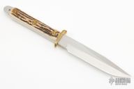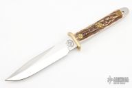 This EK M5 bowie features a satin finished blade with false top edge, .187" blade stock and 1.274" blade depth, full tang construction. The handle has a brass guard and screws with stag scales. Comes with original Ek Box. Has a couple light scratches, otherwise excellent condition.