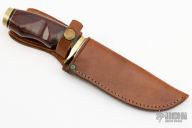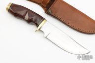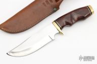 This knife by John Ek Knives features a satin finished blade with false top edge, .190" blade stock and 1.645" blade depth, hidden tang construction. The handle has a brass guard and butt with wood grip, black and brass spacers. Comes with a brown leather sheath. Has scratches, has been used, otherwise good condition. #0165 on the blade ricasso. Ek Knives that are marked "John Ek Knife, Miami Fla" were made between 1949-1976.