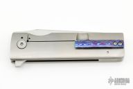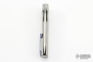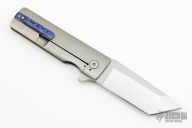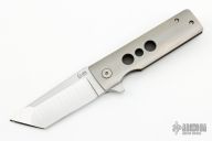 This Grunt by David Clark features a satin finished blade with notched thumbrest and flipper. The handle has an orange peel finished titanium frame with a tip up mokuti clip. Nice detent, lockup and blade seating. Comes with zippered case and COA dated 12-28-2020. Excellent condition.