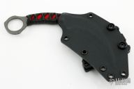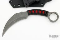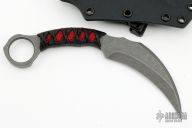 This Karambit by Sam Eddleman features an acid stonewashed blade with false top edge, .188" blade stock and 1.130" blade depth, full tang construction. The handle has black cord wrap over red stingray skin. Comes with a kydex sheath. Has a scratch from the sheath, otherwise excellent condition.