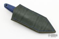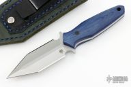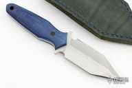 This Tanto Dagger by MST Knives features a matte finished double edged blade with .148" blade stock and 1.174" blade depth, full tang construction. The handle has blue canvas micarta scales. Comes with a black leather sheath with clip. Excellent condition.