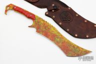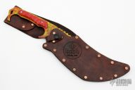 This Mammoth by BMH Knives features an "AZ" Cerakoted blade, notched thumbrest, .126" blade stock and 2.448" blade depth, full tang construction. The handle has red cerakoted aluminum scales. Comes with a brown leather sheath with copper rivets. Comes with a COA. Has a little wear on the scales, otherwise excellent condition.