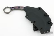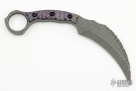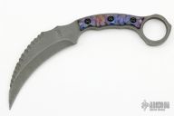 This Karambit by Sam Eddleman features an acid stonewashed blade with false top edge, .188" blade stock and 1.130" blade depth, full tang construction. The handle has black cord wrap over red stingray skin. Comes with a kydex sheath. Has a scratch from the sheath, otherwise excellent condition.