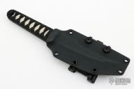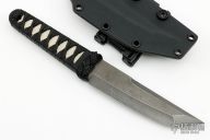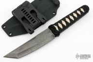 This Tanto by Sam Eddleman features an acid tumble finished tanto blade with false top edge, .265" blade stock and 1.212" blade depth, hidden tang construction. Handle is wrapped in a traditional Japanese style using epoxy soaked nylon cord over white stingray skin. Knife is in excellent condition, shows no signs of use. Comes in a black kydex sheath and a zippered case.