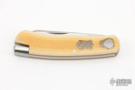 This Native TL by Jared Oeser features a hand rub satin finished blade with nail nick. The handle has Vintage Westinghouse ivory paper micarta covers with a super conductor escutcheon/pivot collar, red and green G-10 liners, stainless spring with tabs on tail. Nice lockup and blade seating. Comes with original box, leather slip sheath and COA dated 12/22/21. Excellent condition.